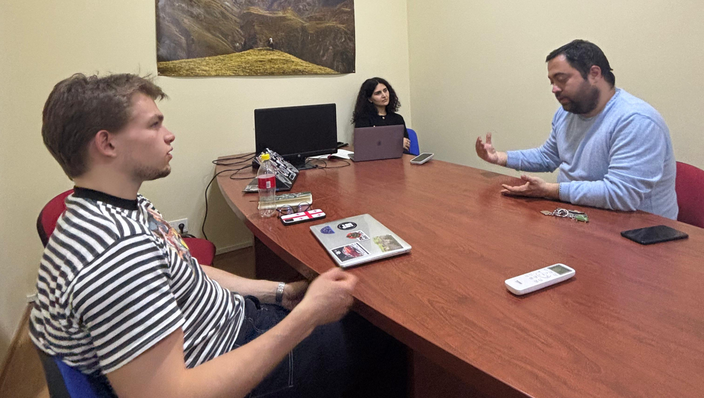 Lo staff di K’argi Mokalake mentre intervista Giorgi Balakhashvili